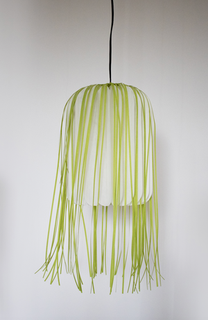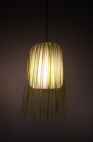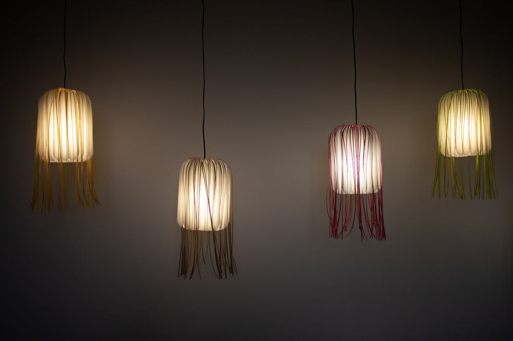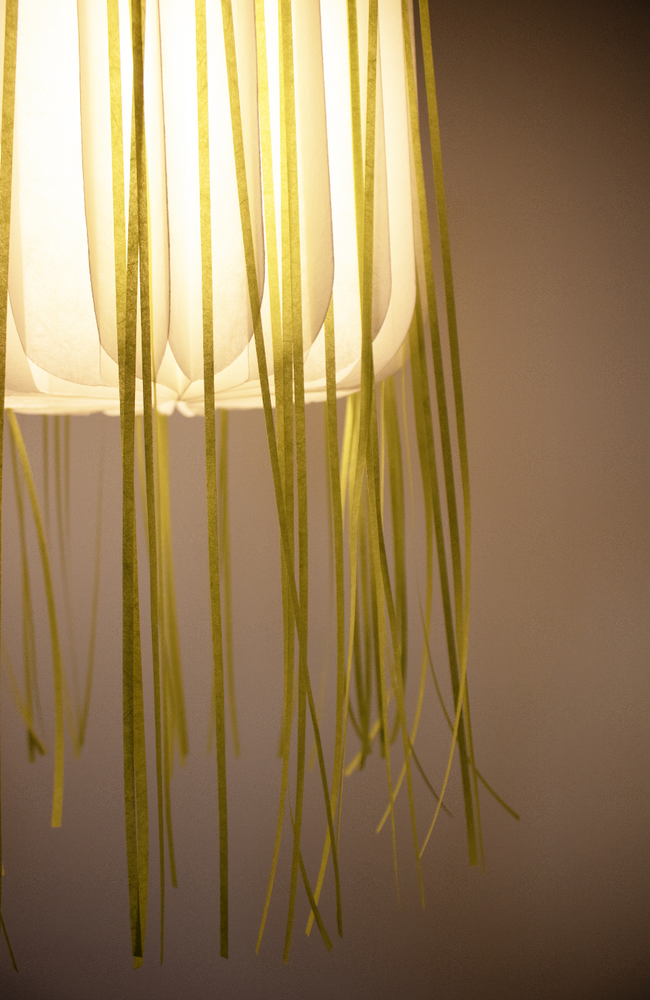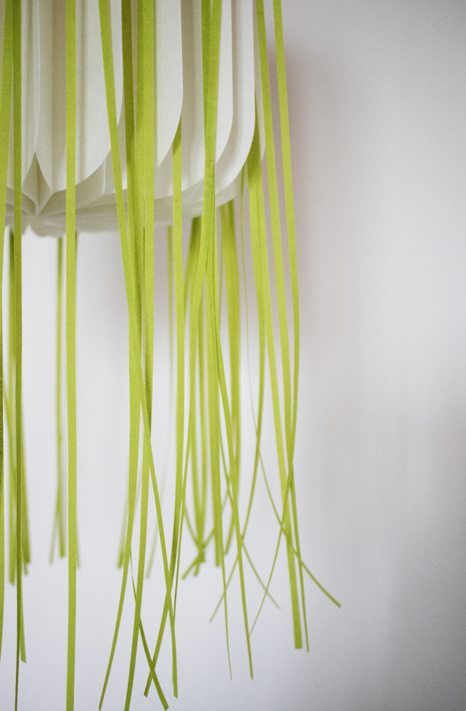 A hanging lamp, designed by Marine Peyre, in white honeycomb from Drop Paper®, combined with colored bangs.